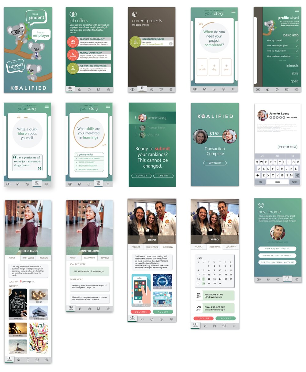 We used Invision to protoytpe a number of screens, co-design on UX worfklows while testing with students and employers throughout. UI and visual design were out of scope for this project, but we did explore a few different design systems for branding's sake.