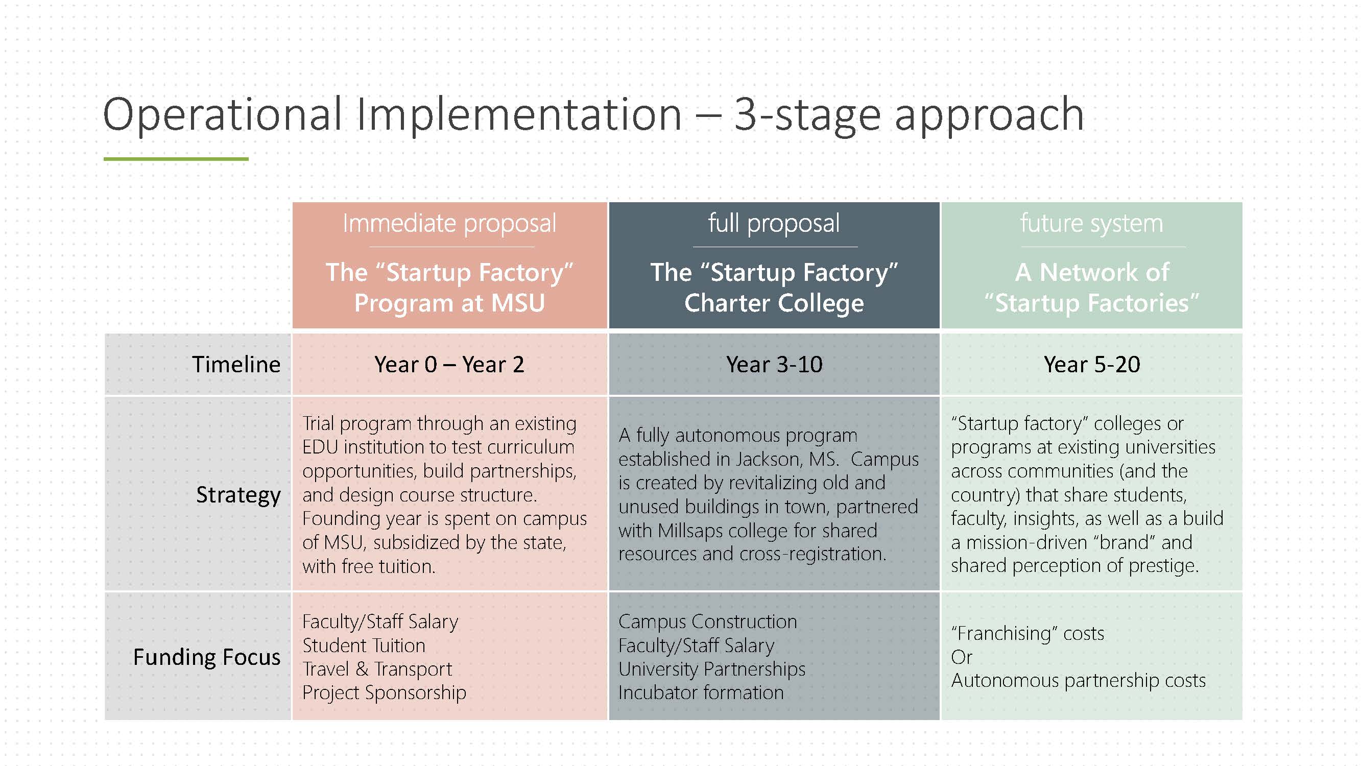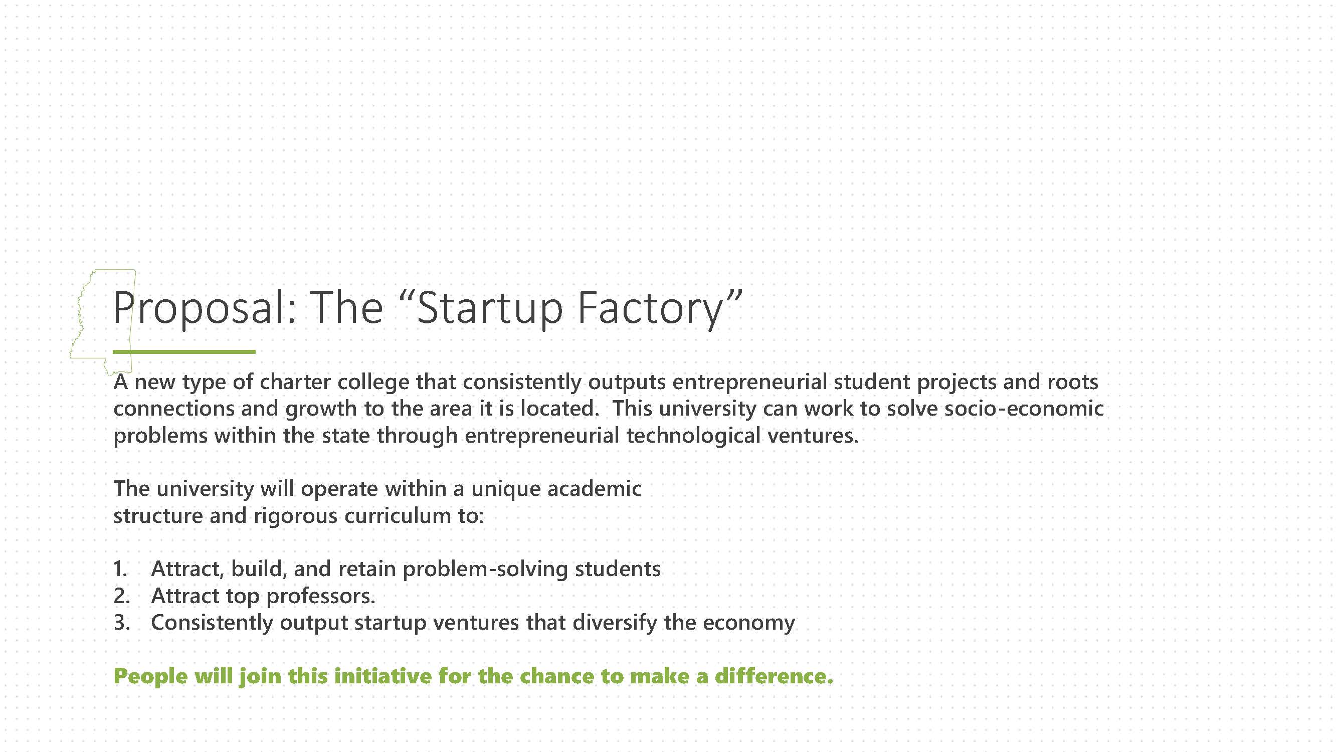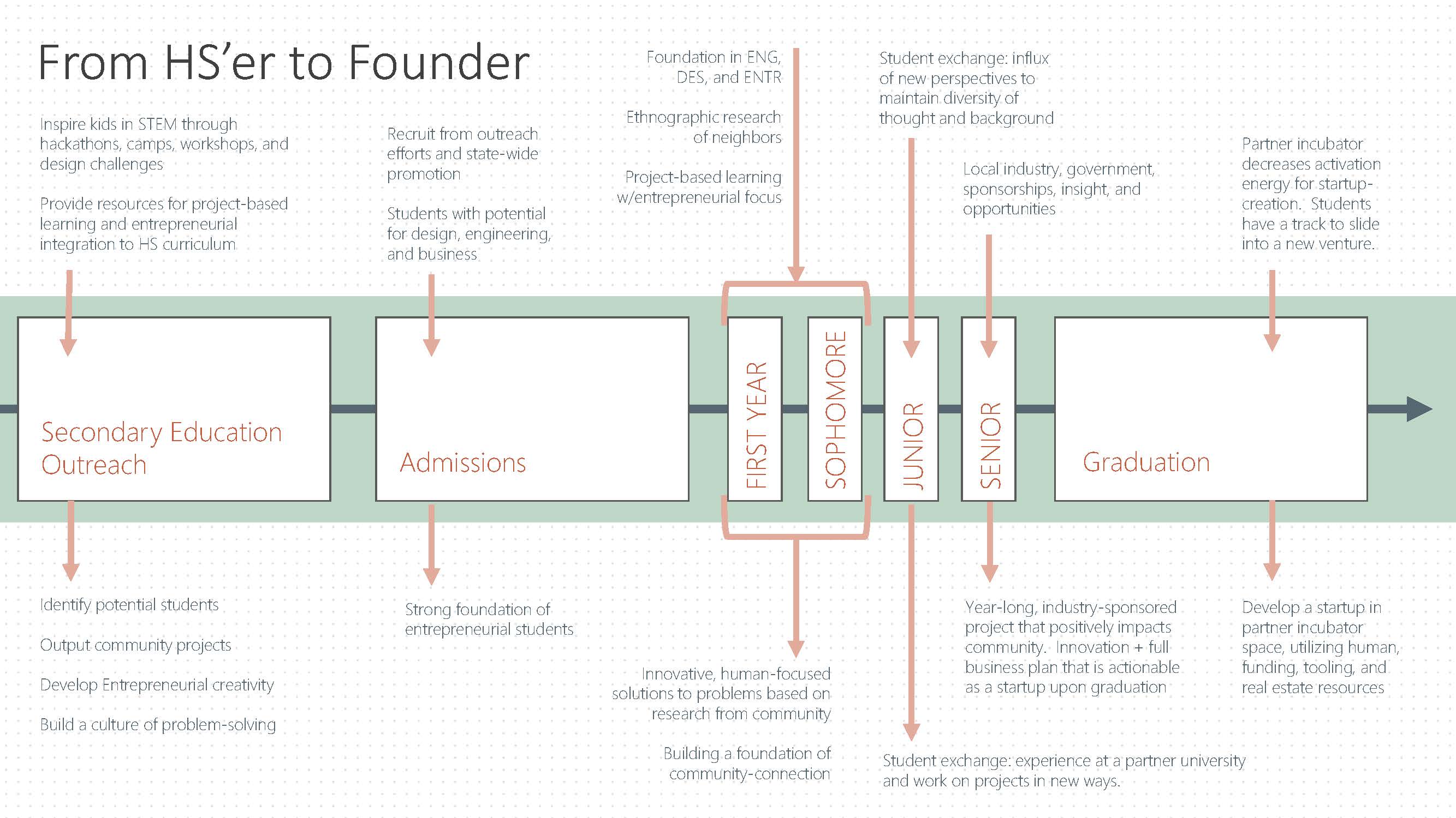 This “Startup Factory” is a mission-driven charter college that merges engineering, design, and entrepreneurship into a project-based curriculum. Grounded in systems thinking, the model tackles economic stagnation and "brain drain" by requiring every student to launch (or co-launch) a startup before graduation—each venture directly addressing local community needs. The proposal integrates organizational design, educational theory, and regional economic strategy to seed sustainable, founder-driven innovation from the ground up.