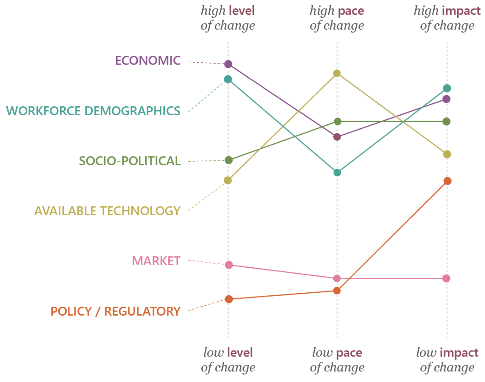 Outside forces and their relative impacts on change within the current organization. Points are notional – based on information presented in the architecture section. Outside forces can be unpredictable, but generally-speaking behave with trends like these when meeting at the interfaces of the system.