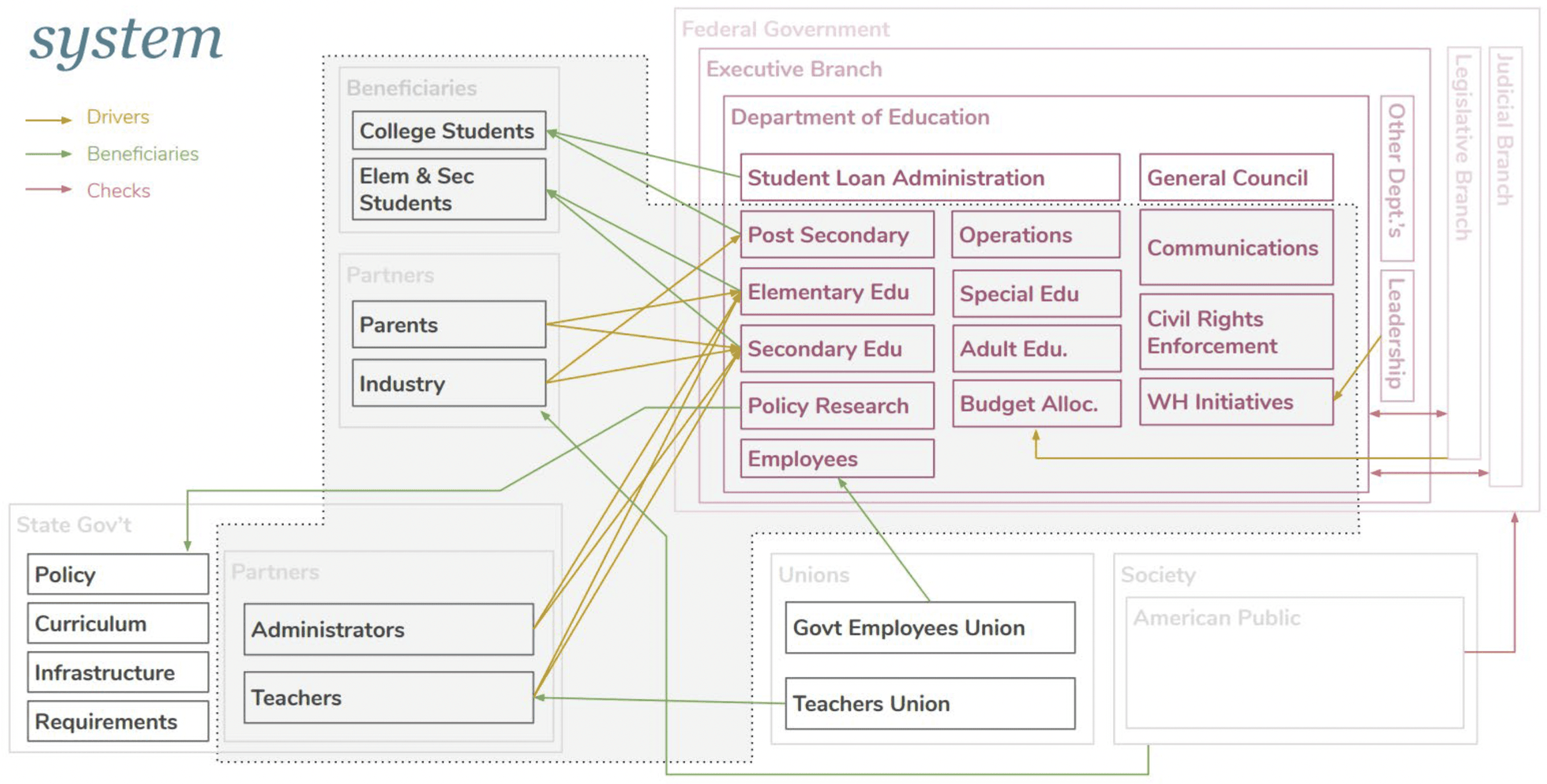 While normally I would be an advocate for early-stage user-research, this particular project was aiming to design a system for a massive range of people (every public elementary and secondary student in America), and a better understanding of the enterprise was necessary to frame stakeholders in categories that could be designed for within that system. To do this: