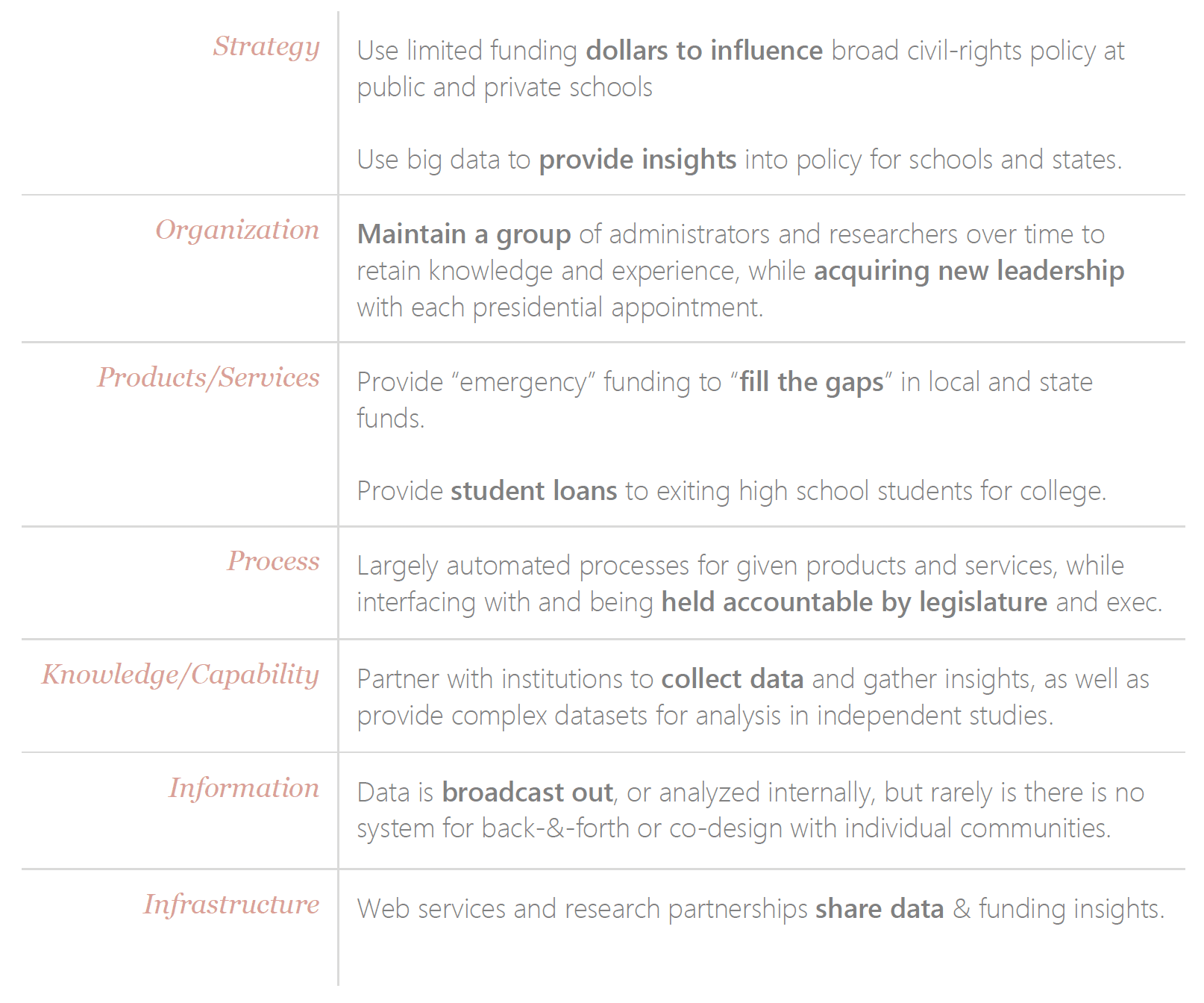 I began by mapping out and analyzing the existing architecture, from the low-level org chart, to the departemnt's position in the federal government.