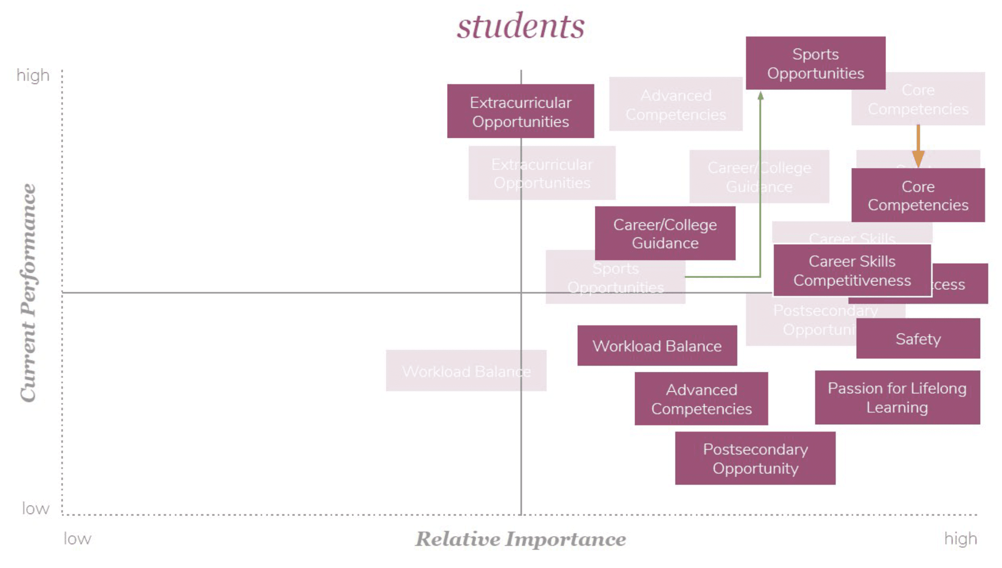 Students values mapped for current performance vs. relative importance. Gradient values indicate a range of possible performance determinations, depending on the interaction with individual states, and the timing of evaluation.
