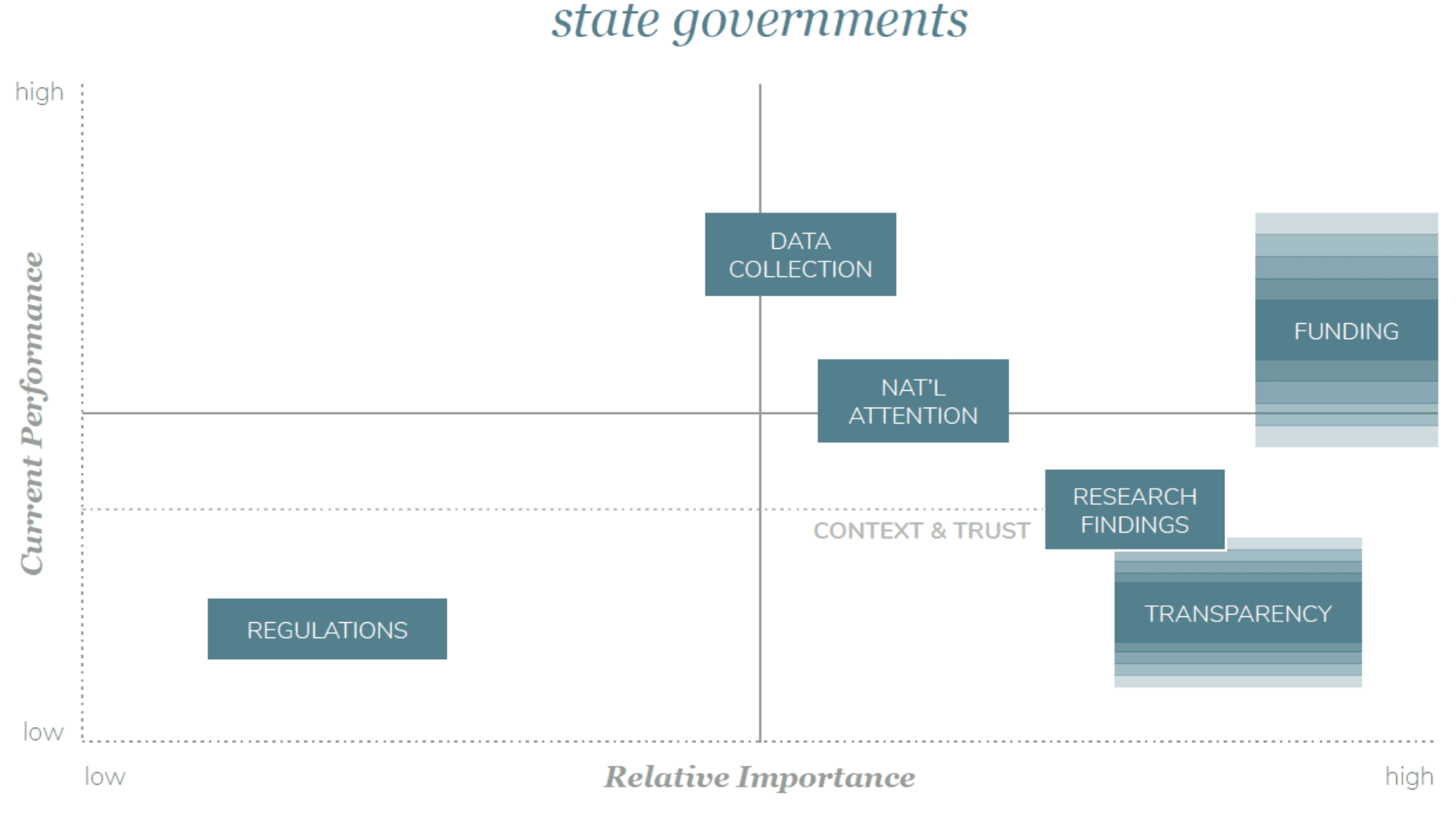 State officials’ values mapped for current performance vs. relative importance. Gradient values indicate a range of possible performance determinations, depending on the interaction with individual states, and the timing of evaluation.